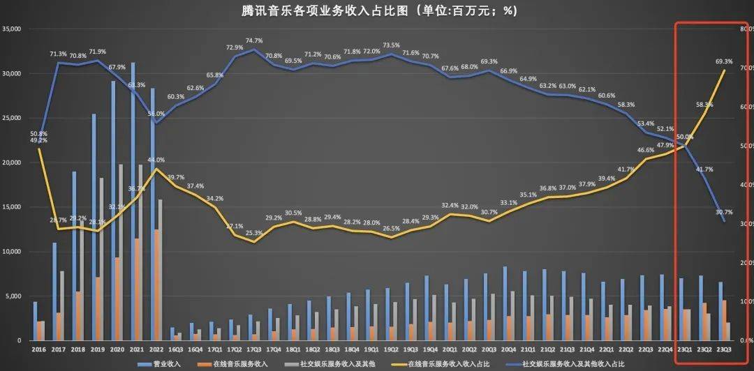 彼时,腾讯音乐执行董事长彭迦信表示,在强调高质量增长的战略驱动下,我们的在线音乐收入增长强劲,并在本季度首次追平社交娱乐服务收入,这标志着我们长期致力于探索可持续发展的在线音乐商业模式已初见成效。
