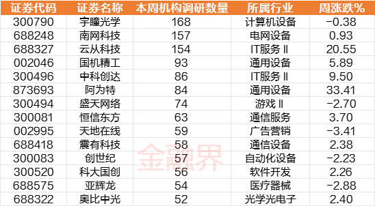 本周(11.13-11.17)披露相关调研信息的上市公司数量达到266家,前一周该数据为392家。这近270家公司主要集中在通用设备(25家)、半导体(20家)、汽车零部件(12家)、软件开发(11家)、消费电子(10家)、光学光电子(9家)。上述公司中3家获得超100家机构调研,宇瞳光学成为机构“宠儿”,合计有168家机构深入调研,南网科技、云从科技等同样获得超过100家机构的聚焦,国机精工、中科创达、阿为特等受青睐。