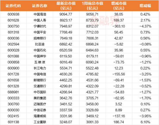 从市值增幅来看(即周涨幅),前五名分别为中金公司、工业富联、三花智控、长安汽车、中国国航;总市值降幅来看(即周跌幅),前五名分别为宁德时代、海康威视、北方华创、山西汾酒、中国电信。