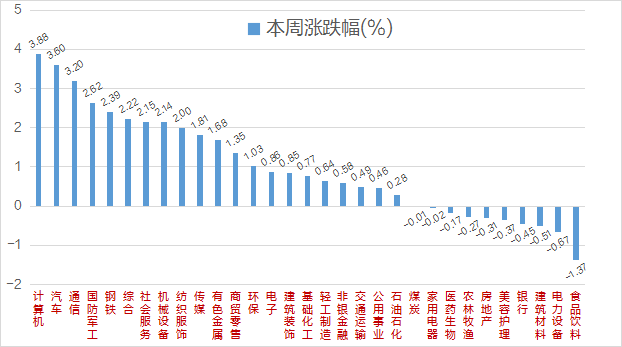 全周维度来看,申万31个一级行业涨多跌少,计算机板块领跑,本周涨幅达3.88%,汽车、通信同样涨超3%,国防军工、钢铁、综合、社会服务、机械设备等涨超2%;食品饮料板块连续两周领跌,本周跌幅达1.37%,电力设备、建筑材料、银行、美容护理等等均小幅下跌。