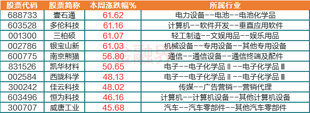 本周十大牛股中,半导体产业链上的壹石通大涨61.62%、凯华材料涨50.65%、西陇科学涨48.13%;算力概念多伦科技涨61.16%、恒为科技涨46.16%;出口概念的三柏硕涨61.07%;汽车产业链的银宝山新涨61.03%%、威唐工业涨45.68%;卫星通信叠加脑机接口概念的南京熊猫涨56.8%;抖音概念股佳云科技涨48.02%。