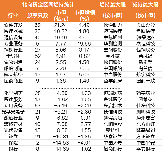 行业增仓方面,截至11月16日收盘的近5个交易日数据显示,软件开发行业被北向资金净买入金额最多,达到了21.24亿元,医疗器械、通信设备分别排在第二、第三位,获增持金额均超过10亿元,专业服务、钢铁行业、半导体、农牧饲渔、船舶制造等行业增持金额相对靠前。大金融成为北向资金出逃的重点方向,银行、保险、证券板块本周分别遭净卖出14.69亿元、14.53亿元以及10.31亿元光伏设备、装修建材、酿酒行业、光学光电子等遭减持规模超5亿元,酿酒行专用设备、医疗服务、化学制药等行业净卖出额规模靠前。