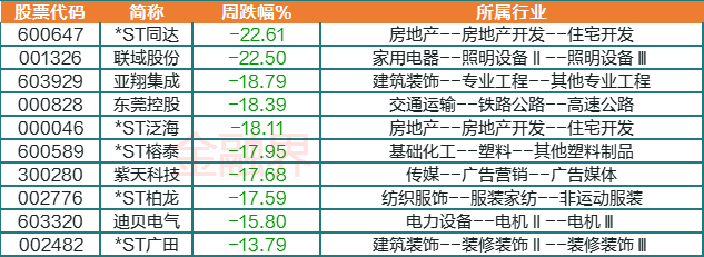 熊股方面,因重组告吹,*ST同达本周累跌22.61%;次新股联域股份跌22.5%;亚翔集成阶段性大涨后回调,本周跌18.79%;券商概念股东莞控股同样跌超18%;遭证监会立案的紫天科技跌17.68%;上涨2连板的迪贝电气本周调整,累跌15.8%;*ST泛海、*ST榕泰、*ST柏龙、*ST广田分别跌18.11%、17.95%、17.59%、13.79%。