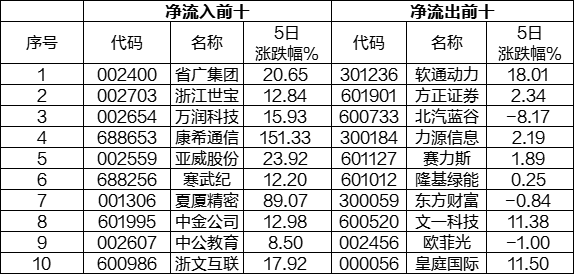 个股方面,省广集团5日主力净流入金额4.78亿元,位居两市之首,浙江世宝、万润科技、康希通信、亚威股份5日主力资金净流入金额也超过4亿元,寒武纪、夏厦精密、中金公司、中公教育、浙文互联等较受青睐;软通动力遭主力出逃16.01亿元,方正证券5日主力净流出金额超过13亿元,北汽蓝谷、力源信息、赛力斯、隆基绿能、东方财富、文一科技、欧菲光等主力净流出规模靠前。