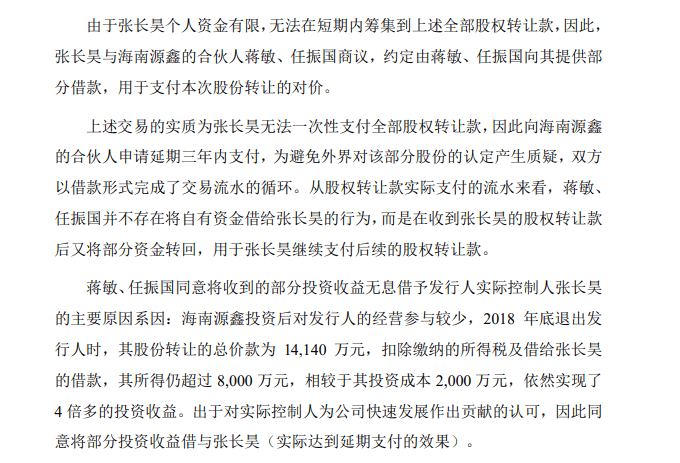 截至前次申报披露的最新文件,张长昊向蒋敏、任振国的借款中仍有2255万元未偿还,此次的招股书中并未显示最新的还款情况。