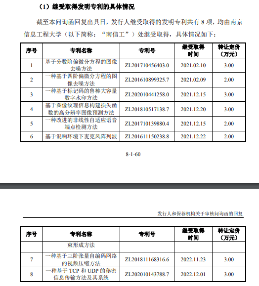 新视云在问询回复中表示,公司8项继受取得的发明专利,仅有基于分数阶方程的图像去噪方法、一种基于四阶偏微分方程的图像去噪方法、一种改进的非线性自适应语音端点检测方 法、基于混响环境下麦克风阵列波束形成方法4项继受取得的发明专利与公司的核心技术相关联,上述4项专利对应公司IP视频信号融合处理和指向性麦克风阵列核心技术。2项核心技术均主要以算法及软件著作权为依托开展,继受取得的发明专利仅起到改善作用,且通过其他方式同样可以替代专利所起作用,并未在核心技术中产生重要影响。此外,继受取得的发明专利授权公告日均为2019年及以后,发行人继受取得的时间均为2021年及以后,均在发行人主营业务发展已较为稳定之后取得,亦未对公司主营业务产生重要影响。