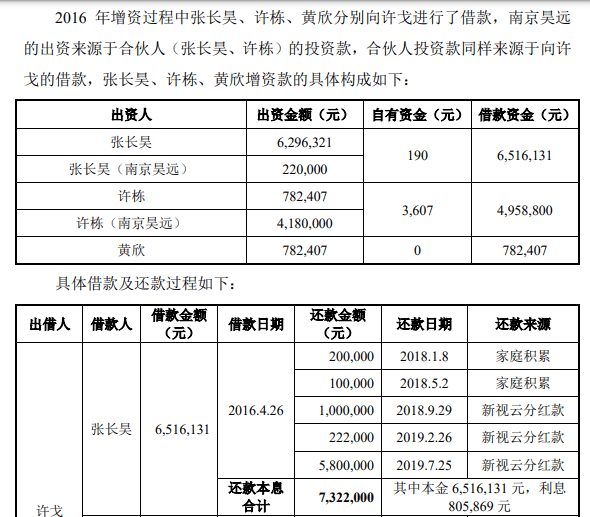 此前问询回复显示,截至2020年12月31日,新视云的可分配利润已超2.5亿元,假设未来以1亿元进行分红,张长昊可以获取的税后分红收益约2000万元。相关银行贷款额度和拟定分红收益可以覆盖张长昊目前的对外借款金额,因此,张长昊有能力偿还蒋敏、任振国的剩余借款。可见,用分红款还债已成为张长昊的惯用招数。