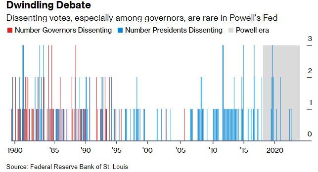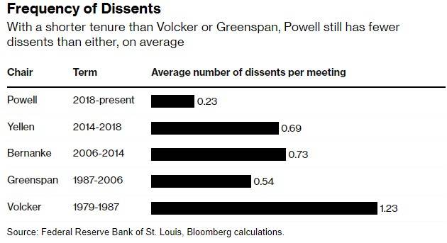 在鲍威尔担任美联储主席的近六年时间里,美联储政策制定者之间的共识在历史上是独一无二的。根据对联邦公开市场委员会投票的分析,截至11月,美联储主席每次会议平均有0.3人持反对意见。这个数字是保罗•沃尔克时期的四分之一,是艾伦•格林斯潘时期的近一半。格林斯潘以在18年的时间里严格控制美联储而闻名。