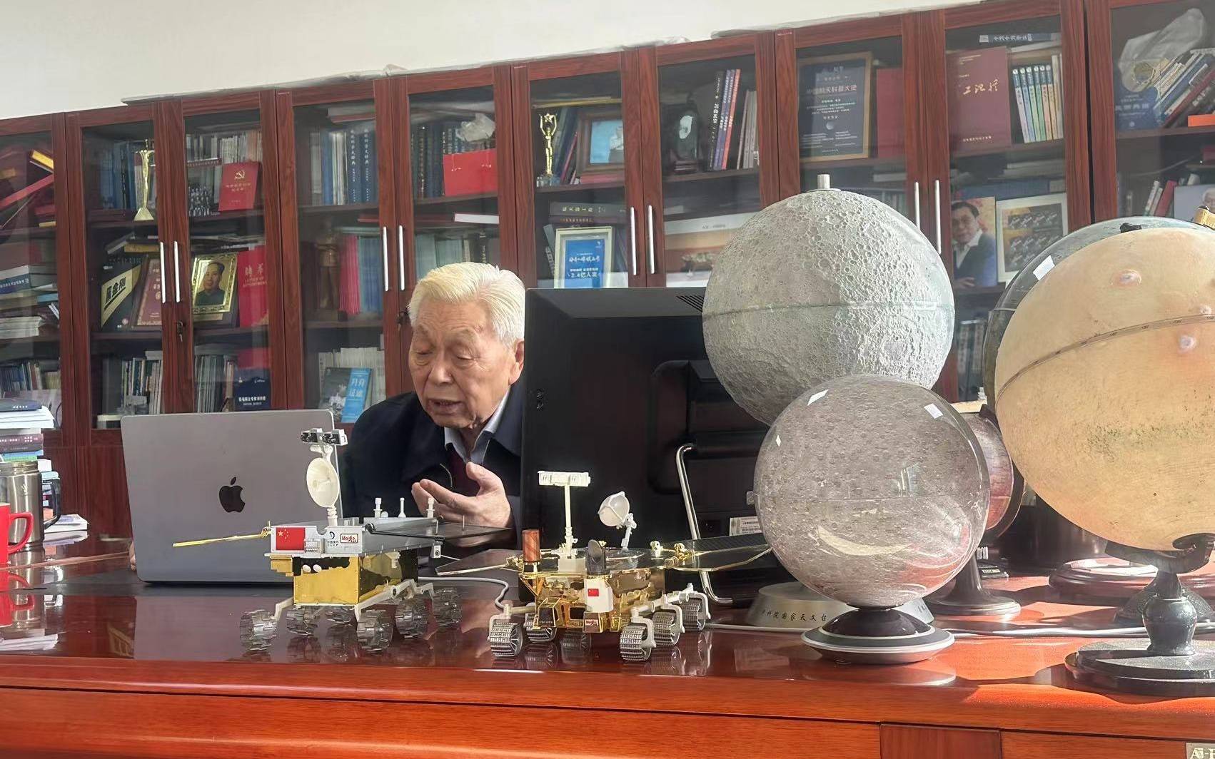 欧阳自远院士在办公室内,以线上形式和延庆区多所中学同学们互动。 新京报记者 刘洋 摄