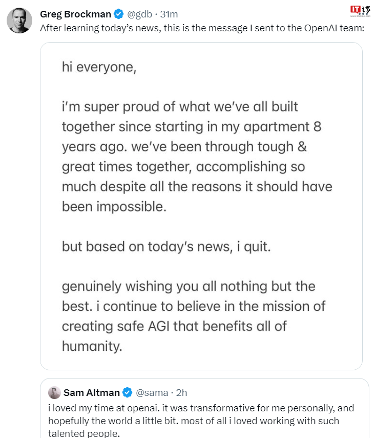 不过就在董事会宣布罢免奥特曼数个小时之后,作为OpenAI的联合创始人Greg Brockman也在 X 发文宣布,“根据今天的消息,我辞职了。”