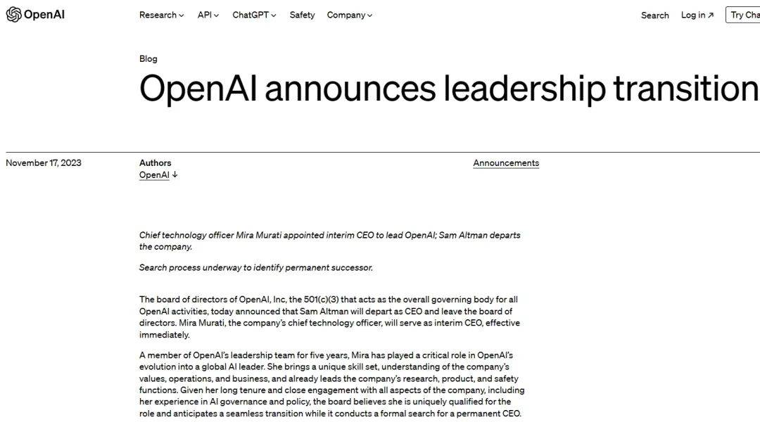 首席技术官米拉·穆拉蒂被任命为临时首席执行官,领导OpenAI;山姆·奥特曼离开公司。CEO的继任人选仍在确认中。