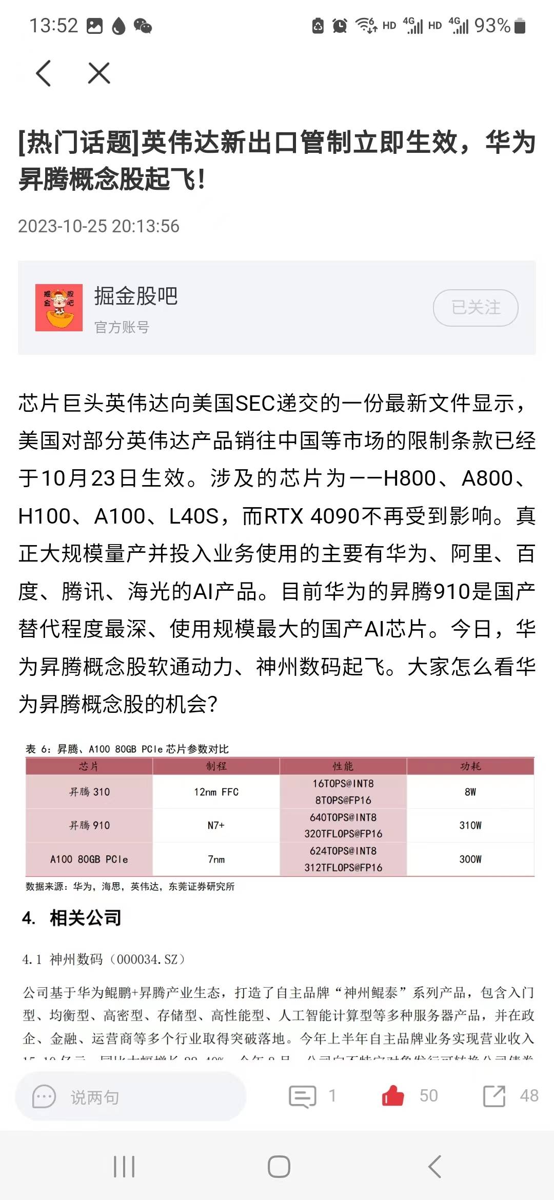 从近期的热门话题来看,除了10月31日晚热门话题提到真人互动影视游戏股(也称作短剧影视游戏股)中文在线翻倍之外,在10月25日晚热门话题提到“英伟达新出口管制立即生效,华为昇腾概念股起飞!”,相关个股神州数码从10月26日以来,震荡走高,累计涨幅达22%,并且在周四盘中股价创了历史新高。