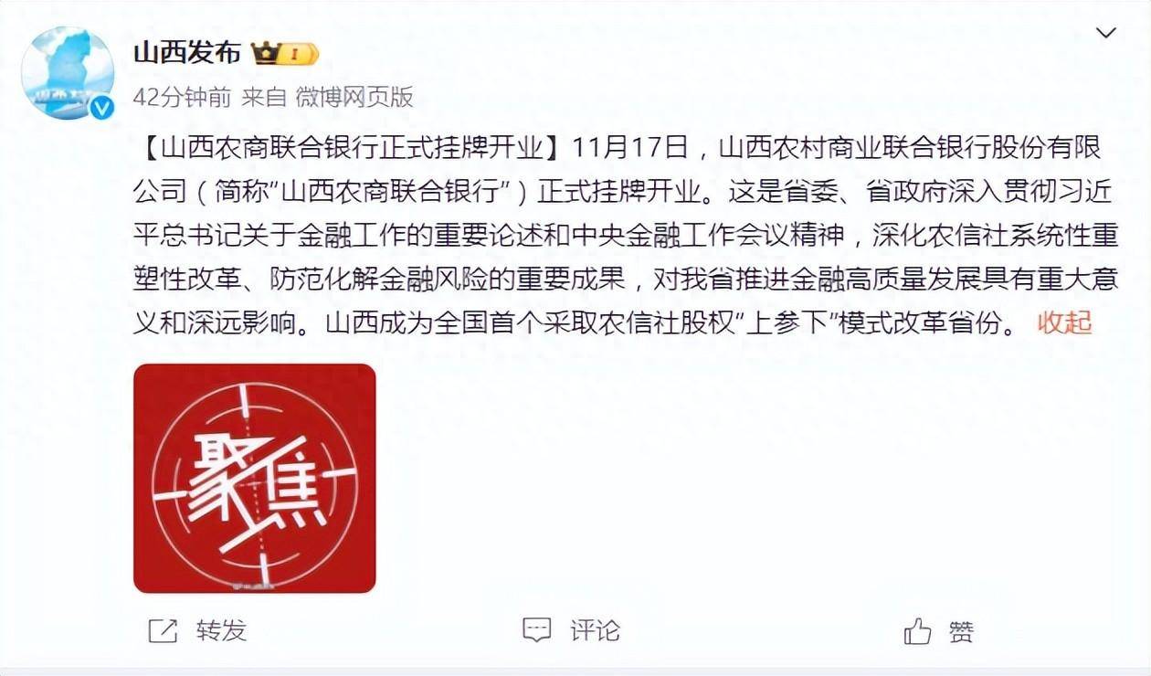 据@山西发布 消息,11月17日,山西农村商业联合银行股份有限公司(简称“山西农商联合银行”)正式挂牌开业。这是山西省委、省政府深入贯彻习近平总书记关于金融工作的重要论述和中央金融工作会议精神,深化农信社系统性重塑性改革、防范化解金融风险的重要成果,对山西省推进金融高质量发展具有重大意义和深远影响。山西成为全国首个采取农信社股权“上参下”模式改革省份。