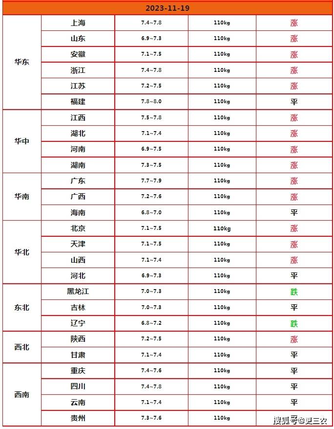 其中,在黑吉辽地区,猪价窄幅下挫,屠企报价在6.8~7.3元/斤,华北市场弱稳偏强,京津市场报价7.1~7.5元,在西北市场,陕甘地区报价在7.1~7.5元。在南方市场,西南地区报价企稳7.1~7.8元/斤。华东、华中以及华南地区,猪价大部偏强,其中,山东、安徽报价6.9~7.5元,浙江报价7.4~7.8元,河南报价6.9~7.5元,两湖市场7.1~7.5元,两广地区报价7.2~7.9元/斤!