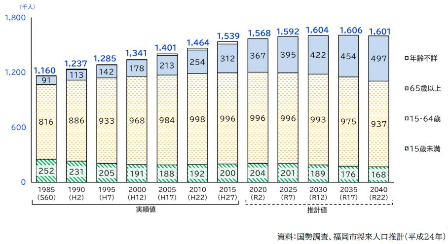 另一方面,福冈市因为都市本身成长的空间仍大,未来预计人口将会增加:2010年人口数量将控制在140万人左右、2016年增加至155万人、2030年预计增加至160万人前后,并在往后的20年都将预计维持这个数字。