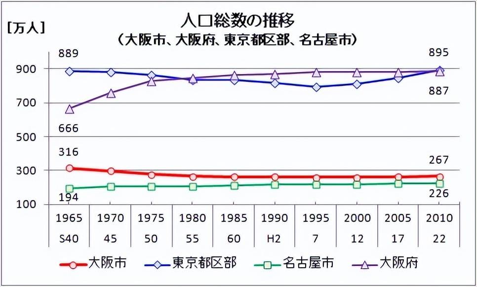 当地人口在2015年前后上升至260万人,此后便持续维持在这个数字左右。根据日本政府所做的国家人口变化预测:大约在2040年,大阪的人口将会减少一成,下降至232万人。这个数字和全国人口总数的减少比例相比,已相对缓和。
