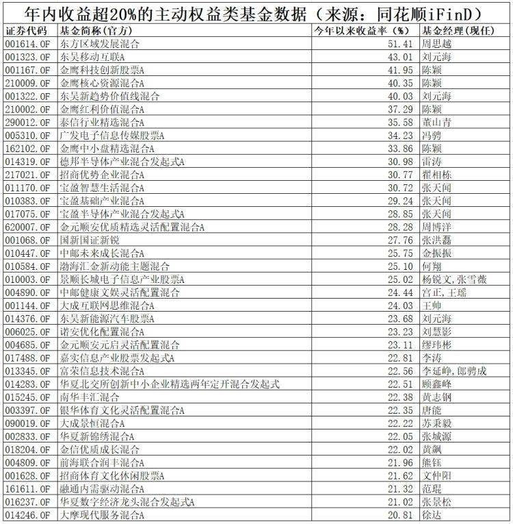 截至目前,主动权益类基金中共有597只产品年内收益为正。其中,东方区域发展混合年内上涨了51.41%,也是唯一一只净值涨幅超50%的主动权益类基金;东吴移动互联A、金鹰科技创新股票A、金鹰核心资源混合A、东吴新趋势价值线混合年内净值涨幅超40%;金鹰红利价值混合A、泰信行业精选混合A、广发电子信息传媒股票A等7只基金涨逾30%。
