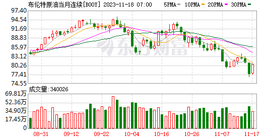 而在前一日(11月16日),国际原油价格遭遇重挫。当日收盘,纽约商品交易所12月交货的轻质原油期货价格下跌3.76美元,收于每桶72.9美元,跌幅为4.90%;2024年1月交货的伦敦布伦特原油期货价格下跌3.76美元,收于每桶77.42美元,跌幅为4.63%。