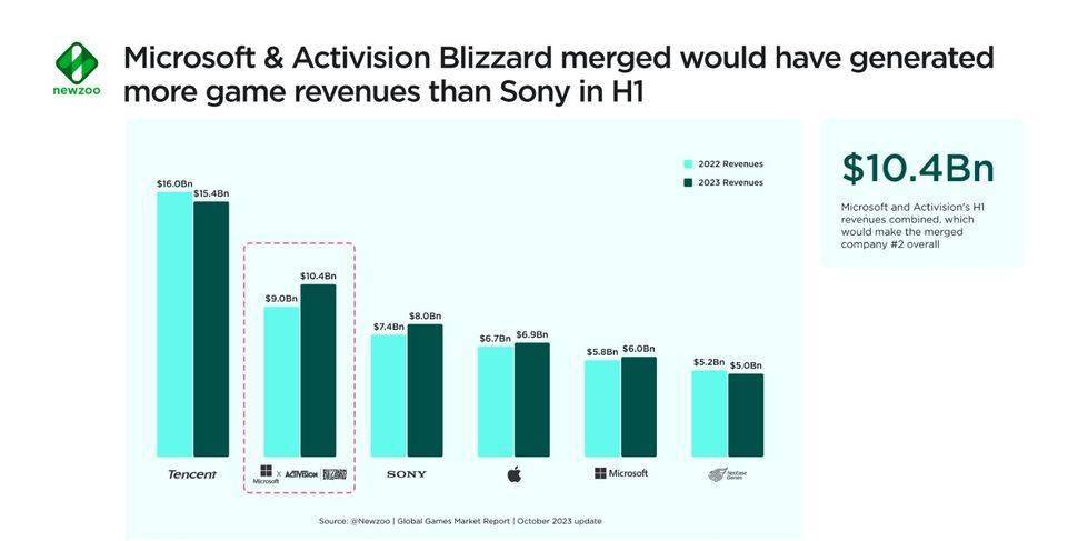 但由于微软收购动视暴雪的交易历经 18 个月,直到今年 10 月份才最终完成,因此上图中动视和微软的收入是分开计算的。该机构分析称,若将二者的收入合并起来,情况将如下图所示: