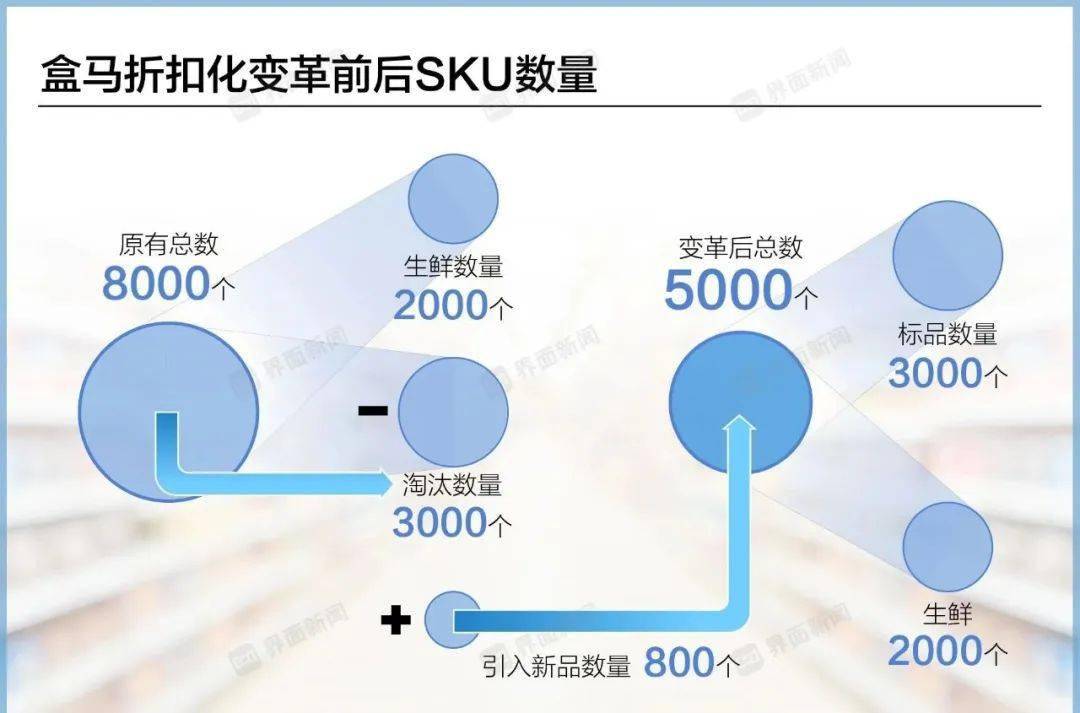 10月13日盒马向外界宣布了全面启动“折扣化变革”。从线下门店开始,盒马大刀阔斧地把5000多款商品在线下的价格下调20%,此外,盒马还在杀伐果断地删减SKU,从标准门店的SKU数量从8000个直接下降到5000个。出手之狠,让同行胆战心惊。