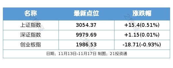 过去一周(11月13日—11月17日),A股三大指数涨跌不一。截至最新(11月17日)收盘,沪指报3054.37点,周涨0.51%;深成指报9979.69点,周涨0.01%;创业板指报1986.53点,周跌0.93%。