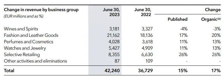2023上半年,LVMH的酒类销售额为31.8亿欧元((约合251.60亿元),同比下降3%;总利润为10.46亿欧元(约合82.77亿元),同比下降9%,该部门也是LVMH在报告期内唯一业绩下降业务部门。其中,占比集团利润54.4%的干邑及其他烈酒板块中的顶梁柱轩尼诗,在报告期内的销量同比下降了20.95%。