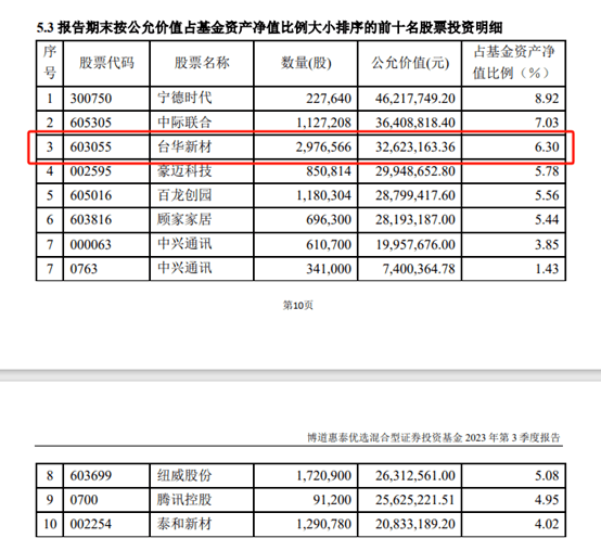 2023年三季度末,博道惠泰优选持有台华新材297.66万股。截至2023年11月16日,该基金A类份额自2023年1月成立以来净值下跌9.14%。