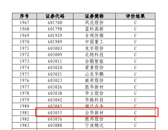 根据最新披露的2022-2023年度信息披露评价结果评价结果,台华新材的信披评价结果被交易所从B降到C。根据评价规则,评价结果分为A、B、C、D四档,分别代表信息披露工作优秀、良好、合格、不合格。