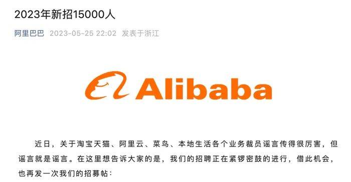 5月底,阿里巴巴集团就对裁员谣言进行过辟谣。