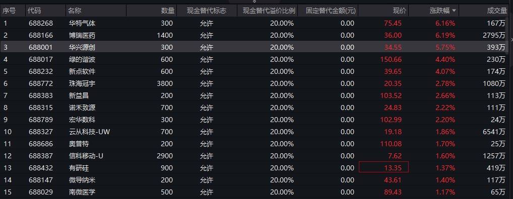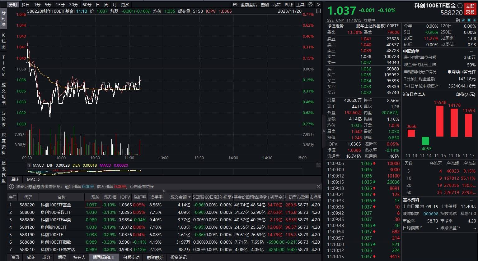 科创100ETF基金紧密跟踪上证科创板100指数,截至2023年11月20日11:10,指数成份股中涨多跌少,华持气体上涨6.16%,博瑞医药、华兴源创等个股跟涨。