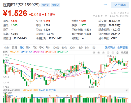 医药板块对应的ETF方面,医药ETF(159929)放量上涨1.19%,成交额超7000万元,强势两连阳!