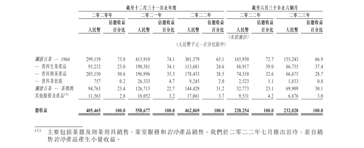 据了解,澜沧古茶旗下主要有1966、茶妈妈及岩冷三大产品线,其中1966专注经典普洱茶的产销,同时也是公司的业绩主力军。招股书显示,2020-2022年,澜沧古茶1966系列产品的营收分别为2.99亿元、4.14亿元、3.01亿元,占公司总营收的比例基本保持在7成左右。